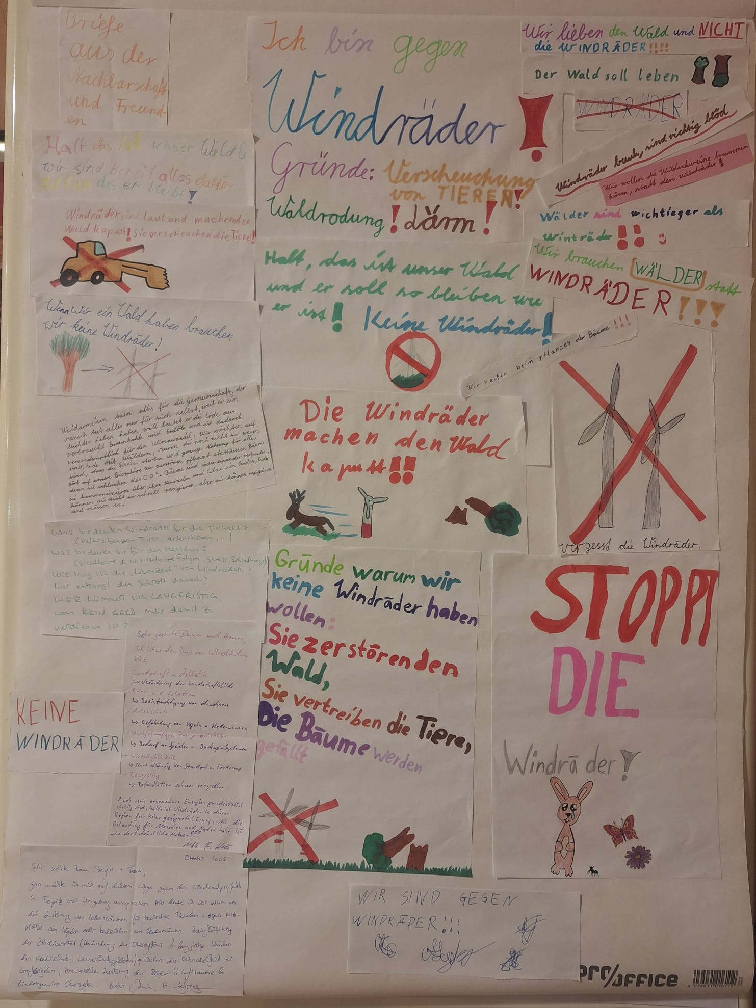 Diese kindlichen Stimmen machen deutlich, dass das Thema Windpark nicht nur Erwachsene beschäftigt. Die Beiträge zeigen eindrucksvoll, wie aufmerksam und reflektiert Kinder ihre Umgebung wahrnehmen und welche Bedeutung Natur und Heimat für sie haben. In bunten Bildern und klaren Worten brachten sie ihre Sorgen, Wünsche und Gedanken zum Ausdruck – von der Liebe zum Wald bis zur Sorge um Tiere und Landschaft.